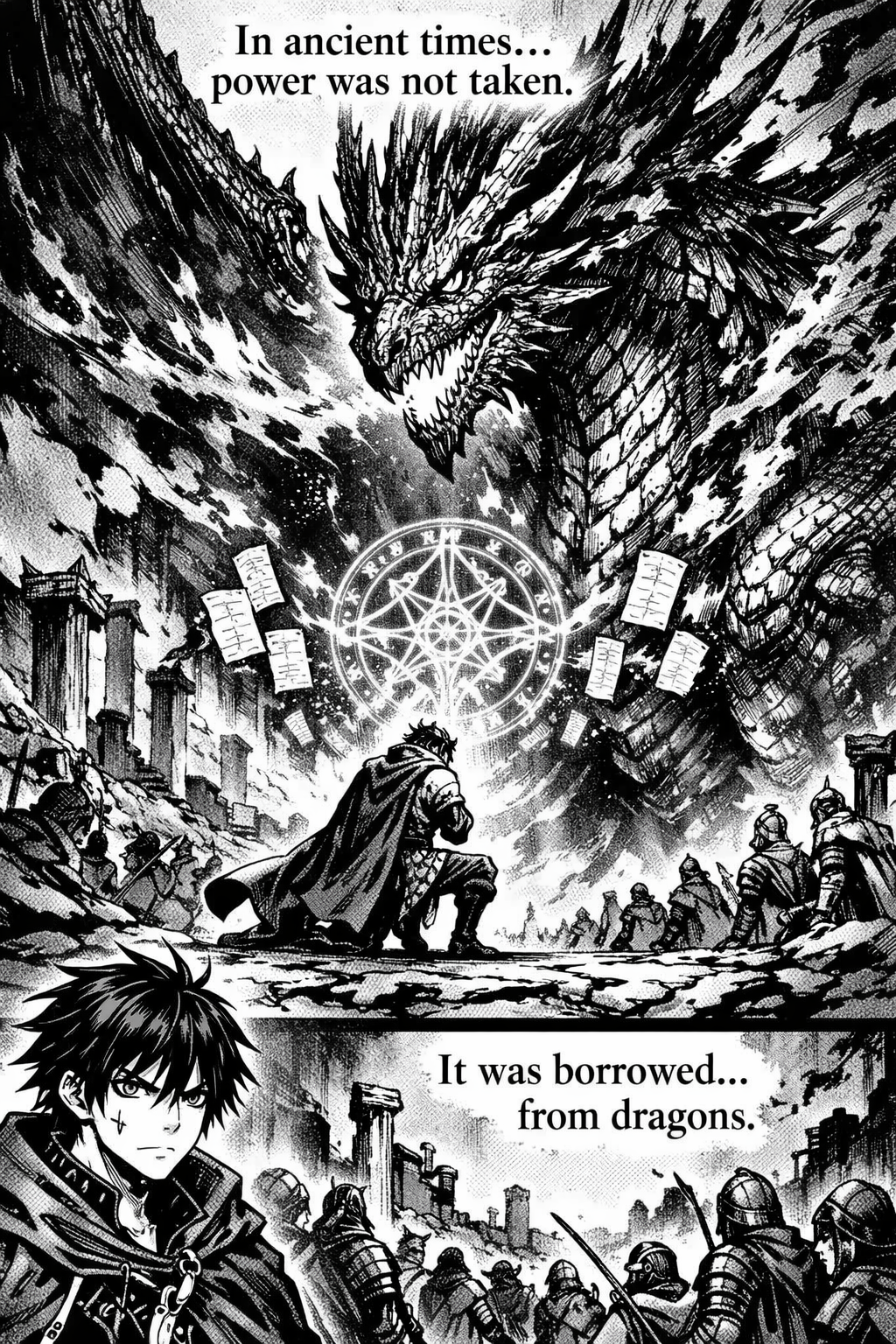 > Manga panel, black and white, a young warrior with spiky hair standing before a massive dragon in a destroyed city. The dragon's eye is glowing. The warrior has his fist clenched with magical energy flowing around it. Dramatic low angle shot, heavy shadows, detailed manga art style. Speech bubble says "I accept your deal."