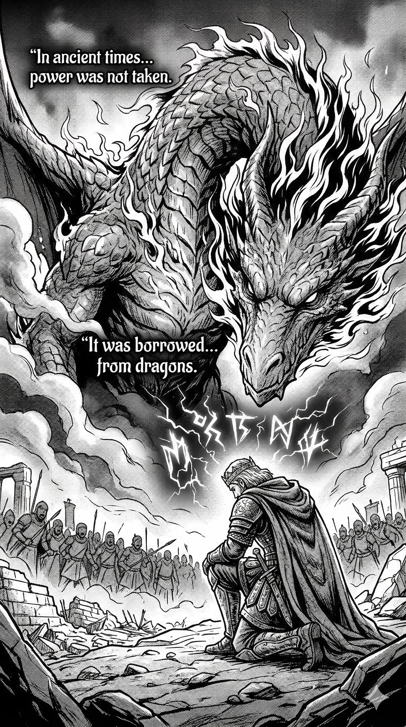 This manga panel was generated using Grok. It features a similar dragon scene but with a different art style -- notice the magic circle, the detailed army, and the two-panel layout with dialogue.